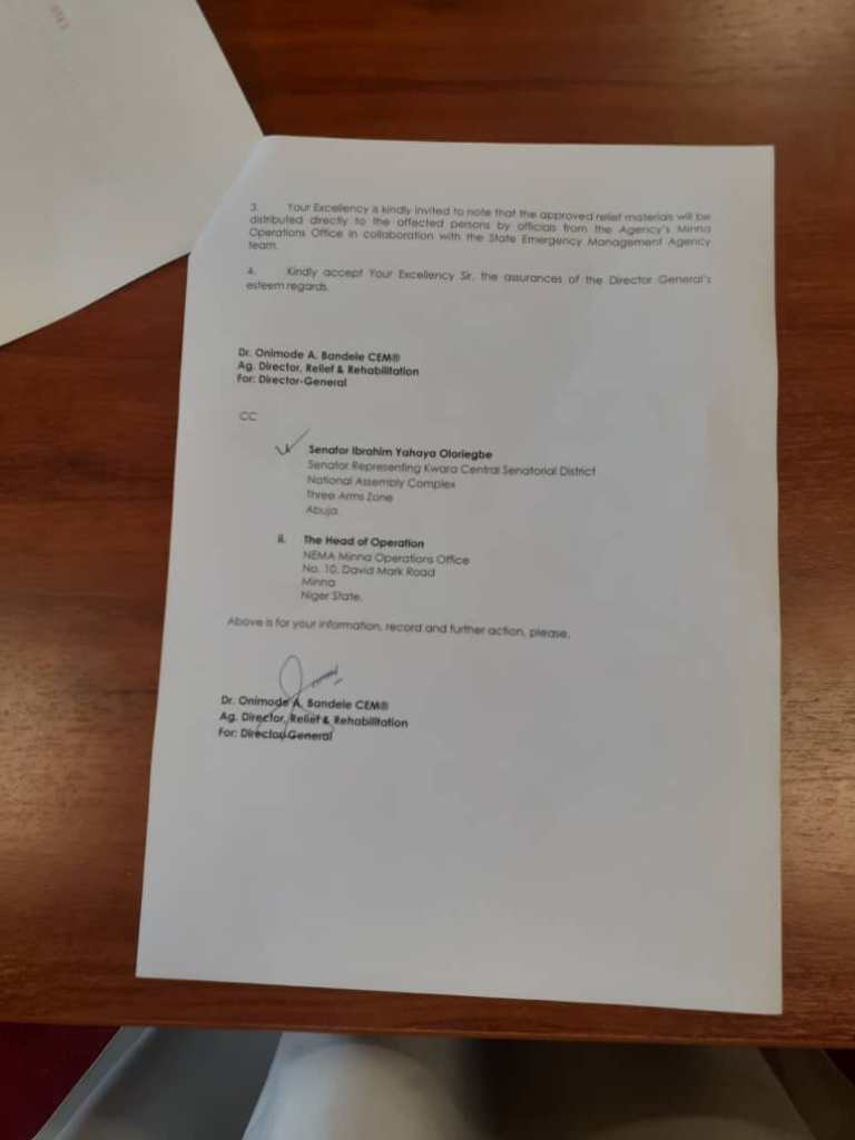 The letter was signed by NEMA’s Ag Director, Relief and Rehabilitation Dr Onimode Bandele.