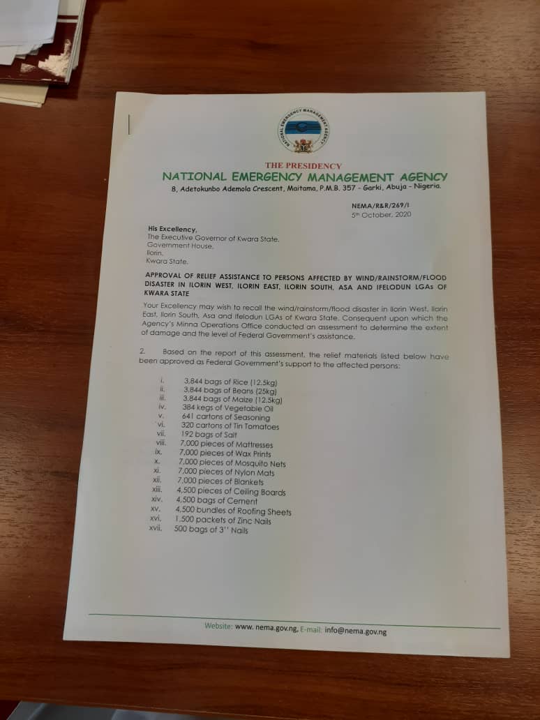 In a letter dated 5th October 2020, addressed to the Governor and copied to Senator Ibrahim Oloriegbe (Kwara Central), NEMA announced the approval of some relief materials for the victims of the incident across Ilorin West, Ilorin East, Ilorin South, Asa and Ifelodun local government areas of the state.